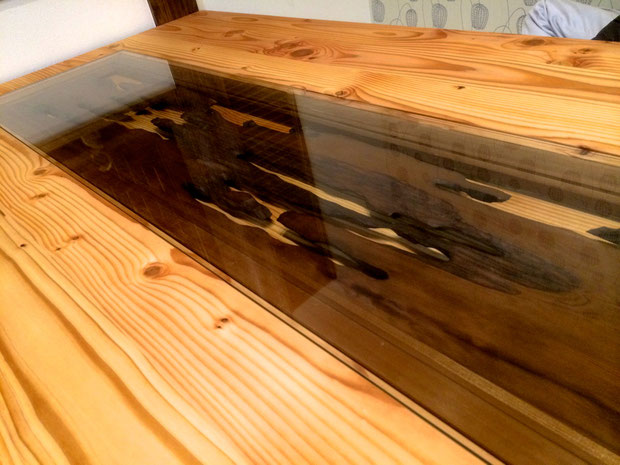 table top : Oregon pine oiled / old openwork screen / tempered glass